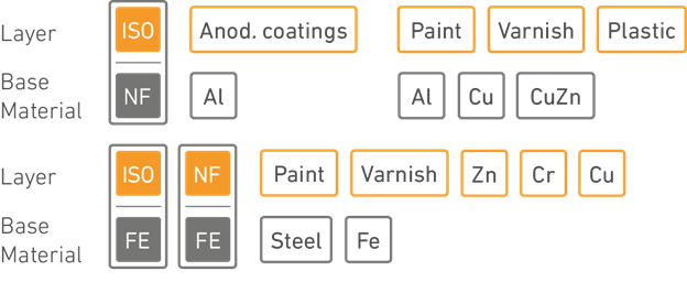 Paint, lacquer, plastic, Zn, Cr, Cu, anodized layers |