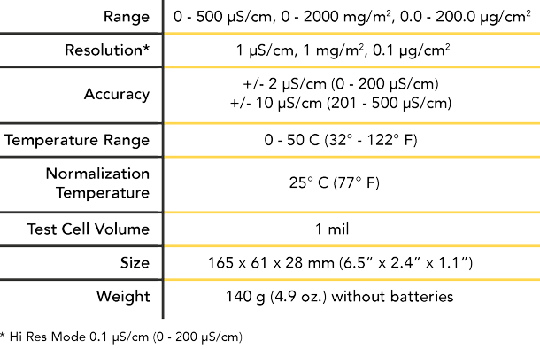 - Displays test duration, sample temperature, conductivity (µS/cm) and surface density (mg/m2 or µg/cm2)